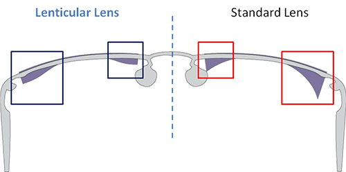 Many labs utilize lens thinning digital design technology (Lenticularization) to reduce curvature and thickness in the periphery of the lens for better cosmetics, safety and comfort in high wrap frames. In addition, design optimization of the lens surface design enhances optics from edge to edge. Finally, wrap and digital design Rx compensation are employed to produce the same Rx power in the “as-worn” frame position as the prescribed prescription power.