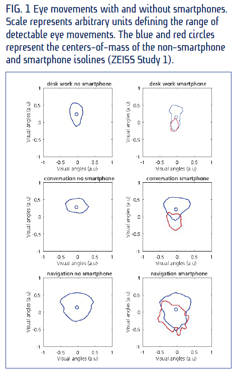 When viewing device screens, we are most comfortable with our arms and elbows close to the body and with our hands positioned close to the torso and below the head. A recent five year study showed that users of handheld devices must bend the upper spine and tip the head forward to adapt to this position. But bending the neck forward still requires downward eye rotation to view our smartphone screen. A recent ZEISS research study showed that spectacle wearers using smartphones turn their eyes to look lower through their lenses, including when performing deskwork, in conversation and while walking. One consequence of this change is that wearers use a larger area of their lenses for a broader range of visual fixations (ZEISS Study 1). Fig. 1 shows the measurements made of the difference in eye movement patterns when using a mobile device. Eye movements when using the smartphone were shifted significantly downward, and the overall area of the lens accessed for vision increases.