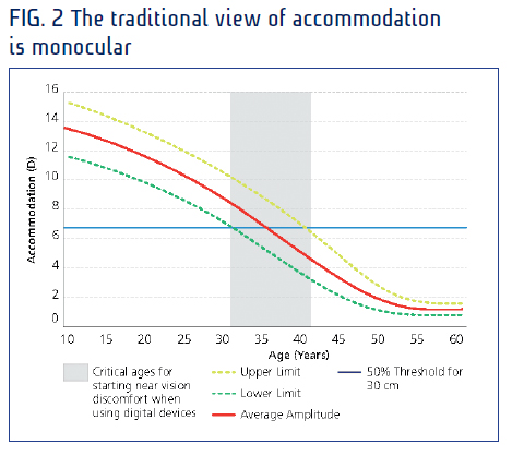 Traditionally ophthalmic optics teach that accommodative amplitude declines with age until the reserve of accommodation no longer allows sustained and comfortable near focus. Fig. 2 graph shows the distribution of the monocular amplitude of accommodation as a function of age. To provide spectacles that will enable at least a 50 percent reserve of accommodation, most people would require an addition power by age 40 when looking at very close objects. The problem with this monocular perspective is that it does not account for dynamic binocular vision. Accommodation is part of an age-dependent multifactorial binocular visual reflex. There are two components of accommodation: The stronger component is driven by binocular convergence while the weaker component is a response to blur. The response dynamics depend on whether vision changes from far to near (“accommodation”) or from near to far (“disaccommodation”). In young people, the accommodation amplitude is greater when the head is pointing face down, but this same effect is not observed in older people. This is an age-related vision factor to consider for mobile device use since the head posture is typically turned downward.