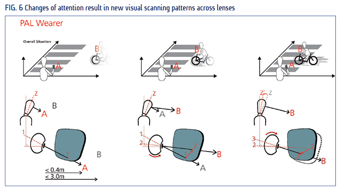 In digital and progressive lenses, the situation is quite different; a progressive increase in addition power in the lens corridor produces peripheral distortion, astigmatism and power errors. These peripheral areas include astigmatic errors and also values of mean power that do not match all possible viewing distances. When an object of interest presents itself to the peripheral vision of a person viewing a handheld device, the resulting eye movements may follow a path where power errors and astigmatism are notable to the wearer. Fig. 6 shows an example. Consider a pedestrian who wears progressive addition lenses and is using a smartphone while walking on a city sidewalk. His attention is fixed on the smartphone (“A”), but as he walks, a bicyclist (“B”) approaches from the right, which he notices with his peripheral vision. Automatically he turns his eyes to view the cyclist, shifting gaze from point 1 on the lens to point 2. A moment later, he lifts his head and continues to follow the cyclist with his eyes for a moment. This sweeps the line of sight along the path from point 2 to point 3. Along this viewing path, the addition power and astigmatic aberration of a multifocal lens are changing continuously. Each person and every circumstance will produce a new line-of-sight path as the eyes acquire new tar gets, like the glide path of a plane coming in for a landing. Each glide path eventually leads back lower in the lens when focused on our handheld device screen. For lens designs to be effective, they must ensure that the distribution of dioptric powers meets the visual needs throughout the region of re-fixations.