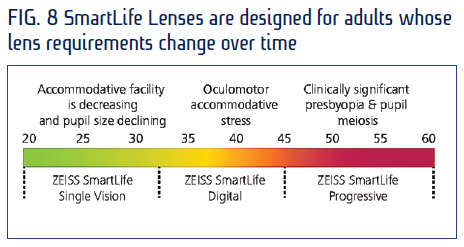 In an external acceptance study among participants who live a connected lifestyle, SmartLife Lenses gave 84 percent of single vision, digital and progressive lens wearers all-day visual comfort (ZEISS Study 4). In this study, 94 percent of SmartLife Single Vision wearers perceived wide fields of comfortable vision for intermediate and near vision tasks. Seventythree percent of SmartLife Digital Lens wearers reported feeling no strain at the end of the day, and the majority reported feeling less eyestrain compared to their habitual lenses. Four out of five SmartLife Progressive wearers experienced smooth vision from near to far across all viewing zones. Although ZEISS provides general guidance for the use of SmartLife Lenses, it is the eyecare professional who is best able to judge when it is time for any person to take the next step in lens type. Fig. 8 illustrates a life timeline that might be applied to any individual. In the early years, a person may or may not have a significant need for vision correction.