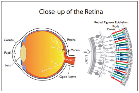The goal of the extraocular muscles is to keep the object in view aligned with the fovea of each eye. The retina is the multilayered neuro-sensory tissue that lines the back of the eye. In the center of the retina is the macula, located temporal to the optic nerve. The macula, also known as macula lutea (yellow spot), is responsible for sharp central vision and color vision which enables us to see fine detail and perform visual tasks which require sharp central vision. Located at the center of the macula is the fovea, the area of highest resolution vision. The fovea contains few rod photoreceptors while it is densely packed with cone photoreceptors. This distinction is important because there are two types of photoreceptor cells, cones and rods, but only the cones function for both photopic (daylight) vision and color signals that the brain uses to produce color perception.